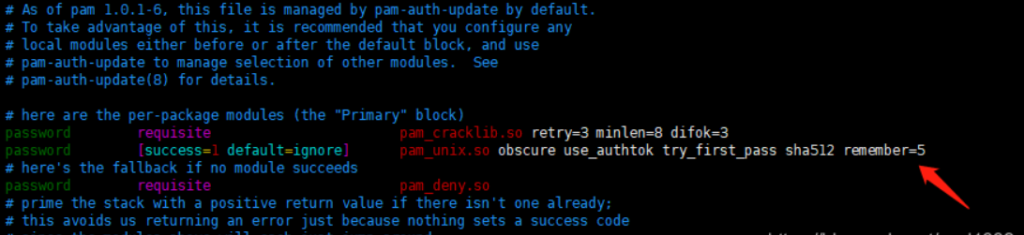 找到如下配置,并在后面添加remember=5,表示禁止使用最近用过的5个密码,己使用过的密码会被保存在/etc/security/opasswd