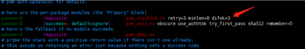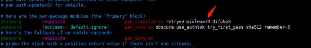 找到如下配置,并将默认的minlen=8改为minlen=10,表示最短密码长度需要为10