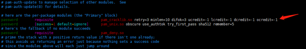 找到如下配置,在后面添加ucredit=-1 lcredit=-1 dcredit=-1 ocredit=-1,它表示密码必须至少包含一个大写字母(ucredit),一个小写字母(lcredit),一个数字(dcredit)和一个标点符号(ocredit),具体按照需要修改即可